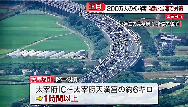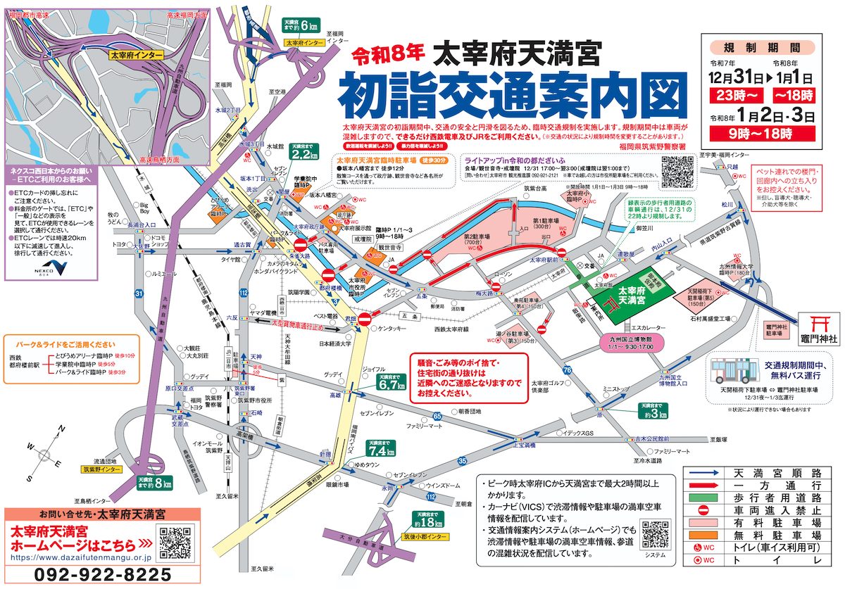 年末年始は、太宰府天満宮前から西鉄太宰府駅や西鉄二日市駅周辺にかけて、歩行者道路、一方通行、車両通行止めなどの交通規制がかかります。